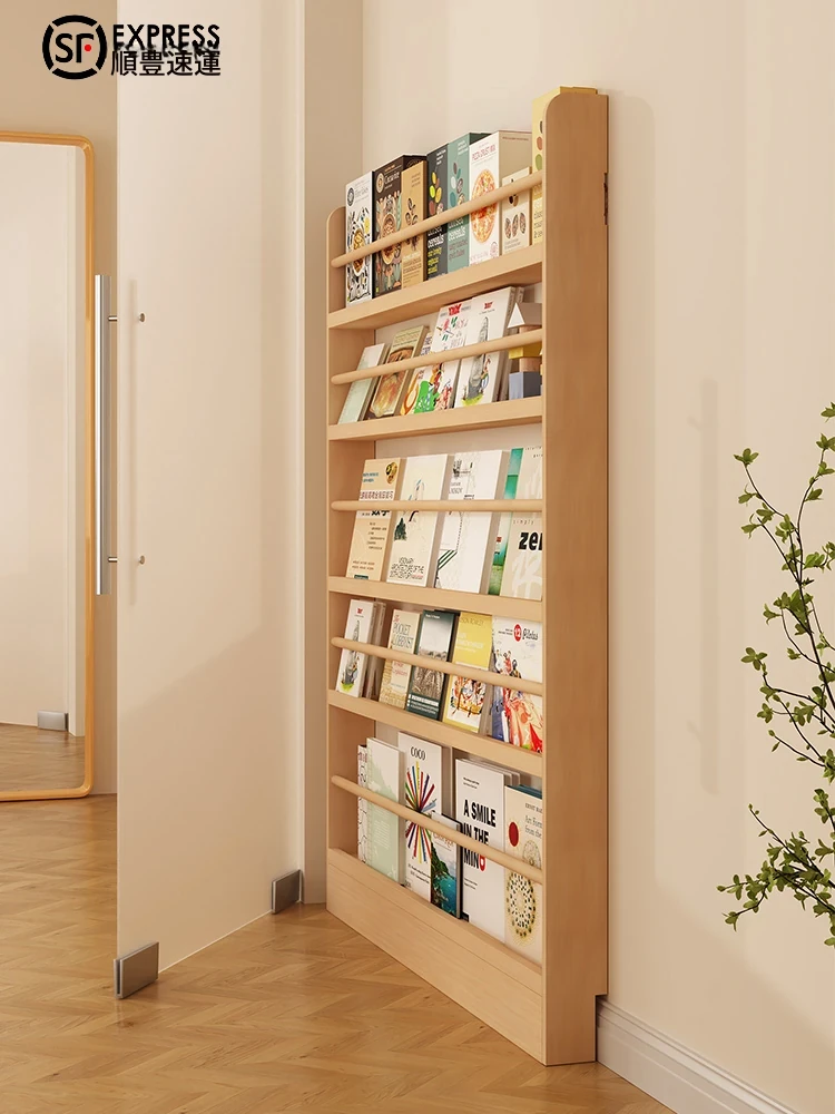壁掛け型子供用書棚 - 超薄・超狭設計の無垢材製マガジン&絵本ラック!スペースを有効活用し、お部屋をスッキリ整理。おしゃれで機能的な収納で、お子様の本を素敵にディスプレイします。