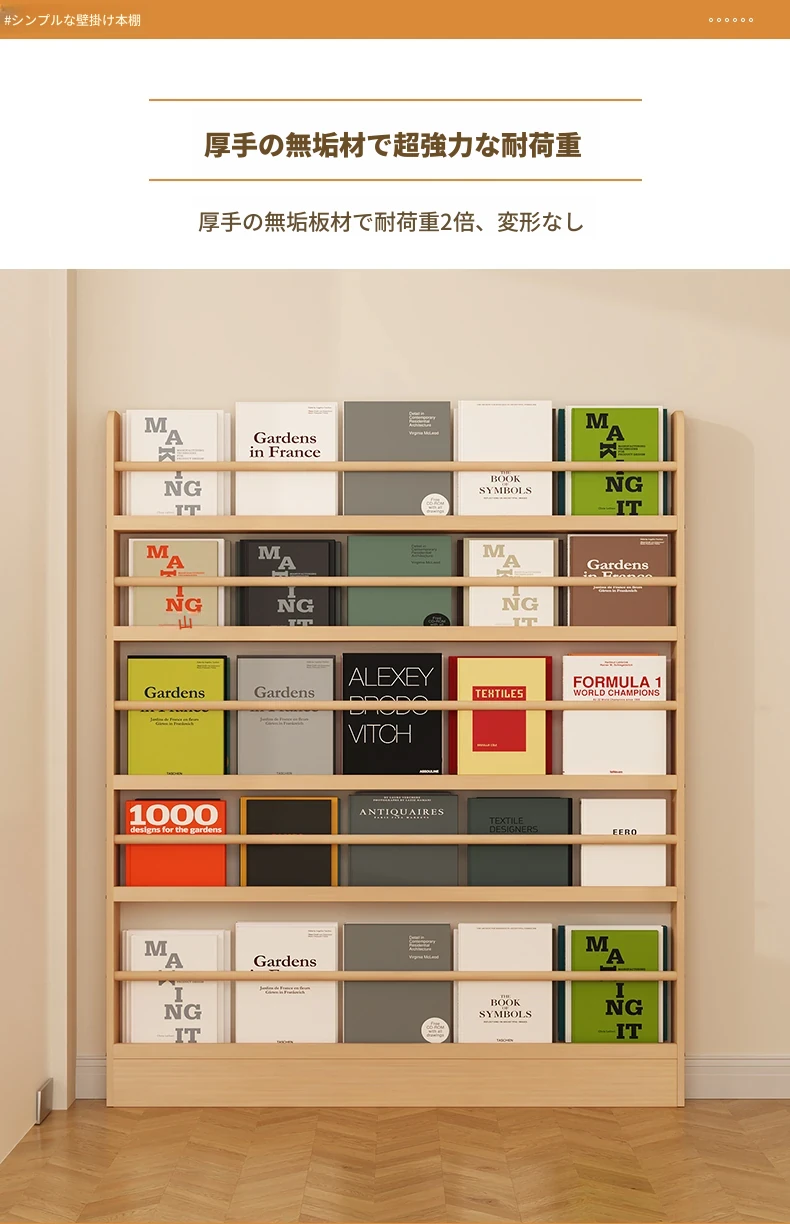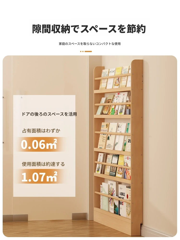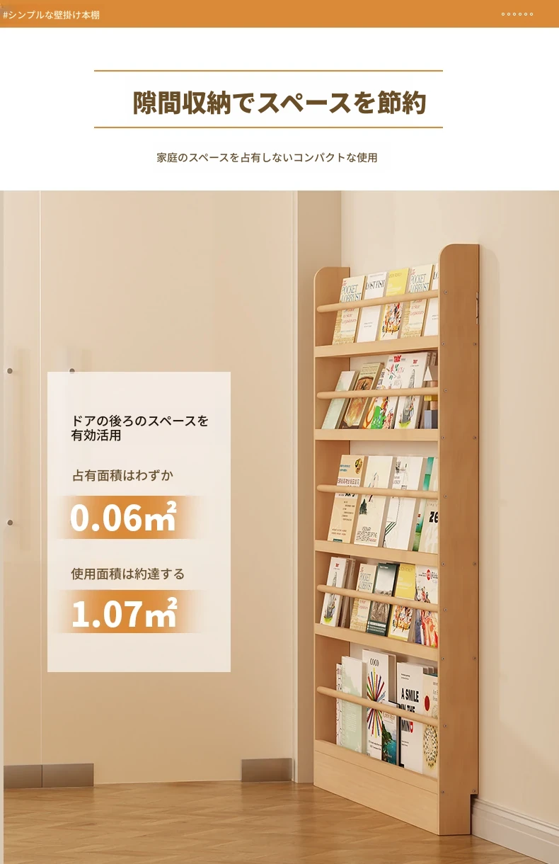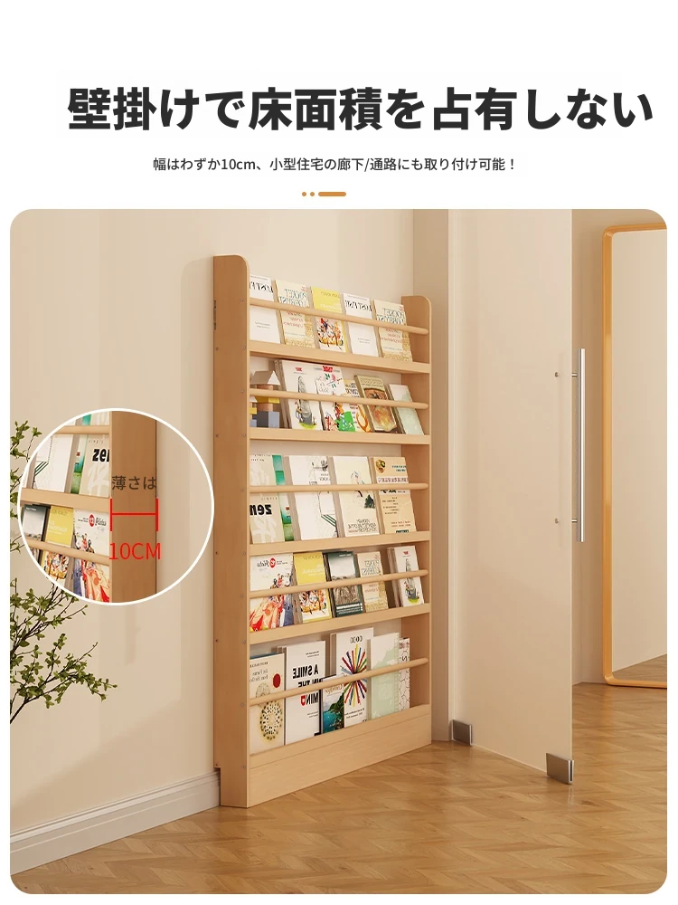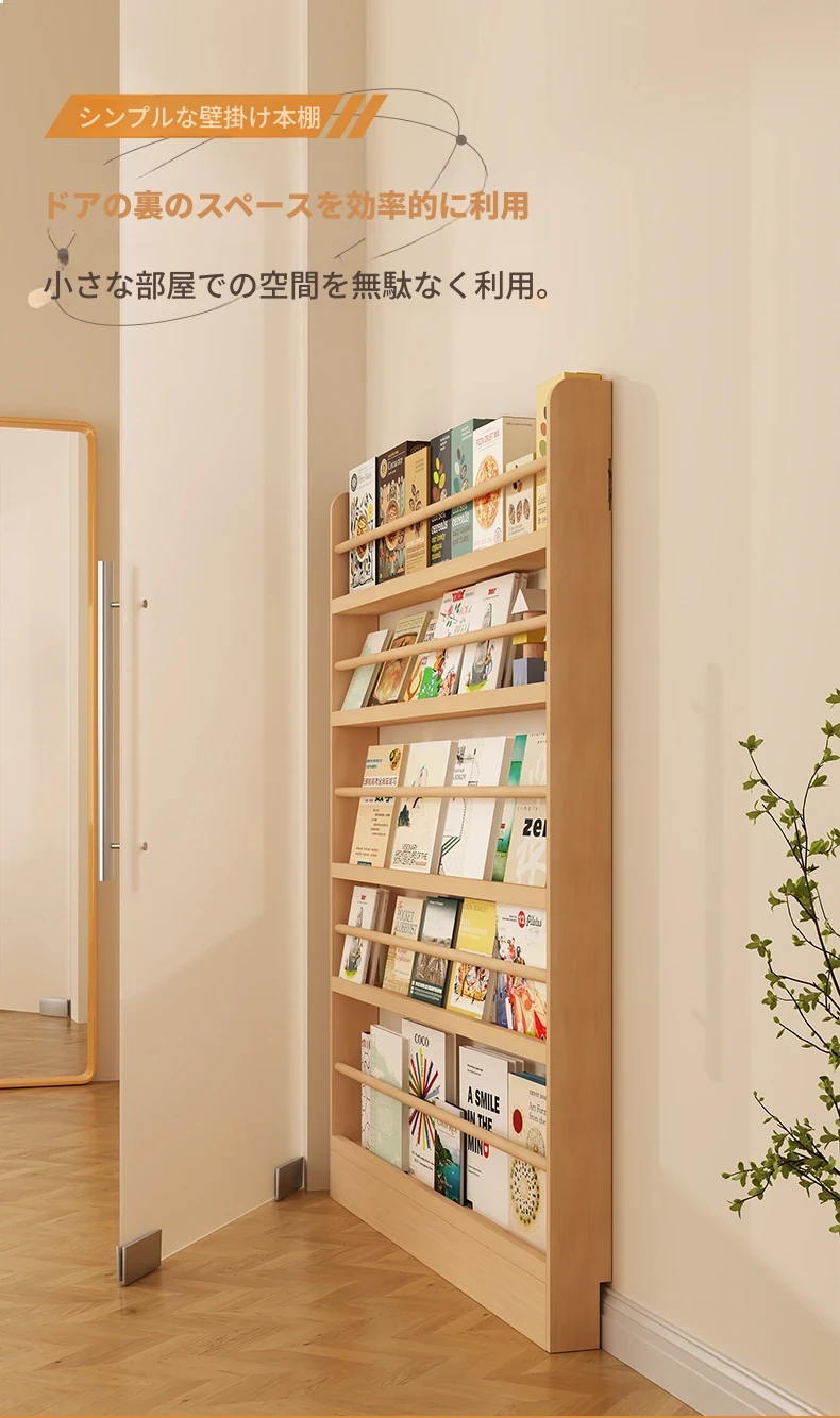 壁掛け型子供用書棚 - 超薄・超狭設計の無垢材製マガジン&絵本ラック!スペースを有効活用し、お部屋をスッキリ整理。おしゃれで機能的な収納で、お子様の本を素敵にディスプレイします。