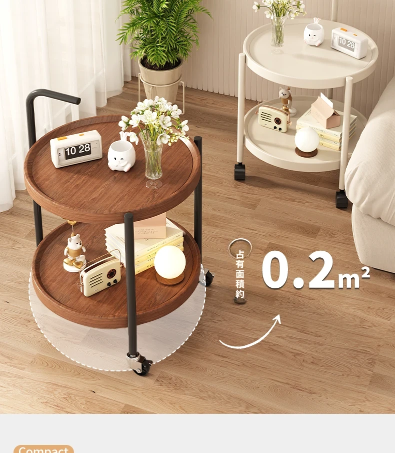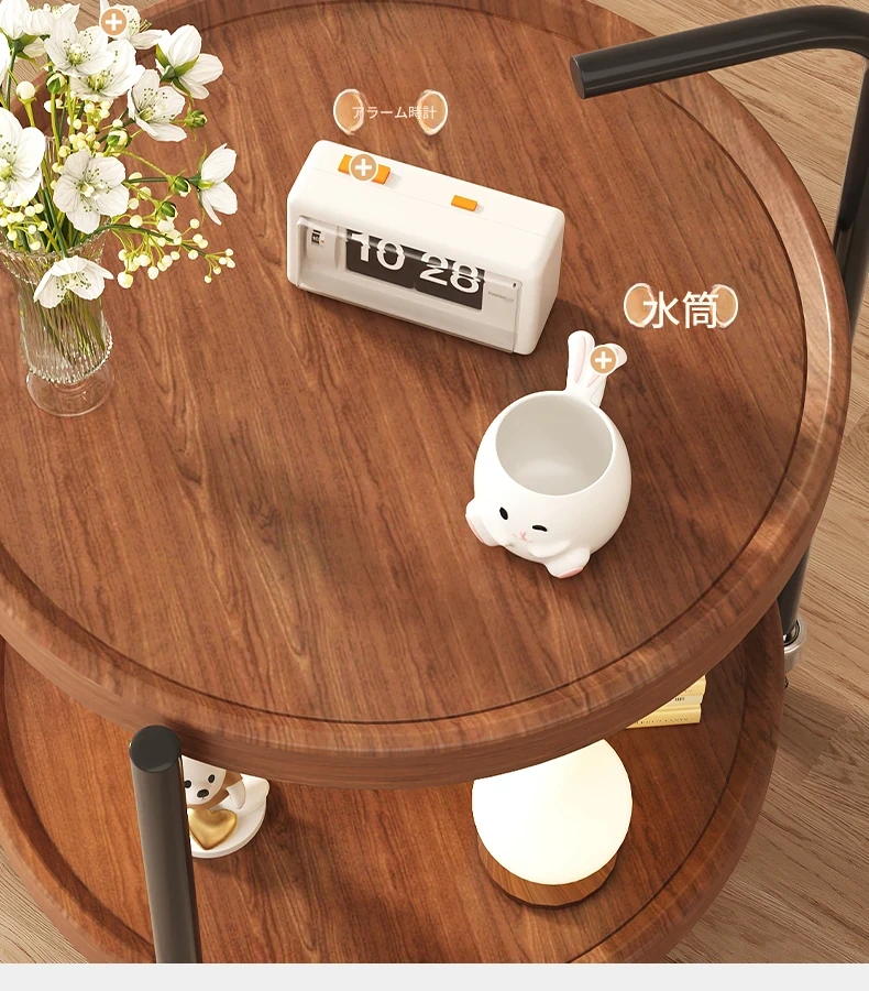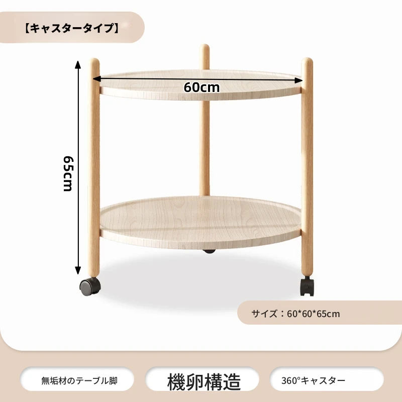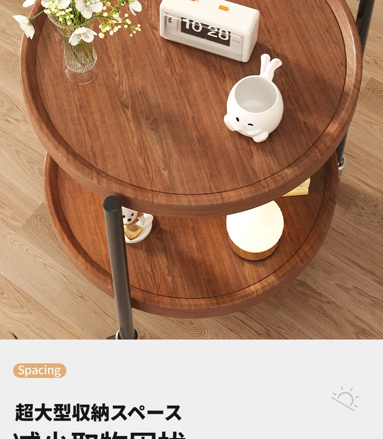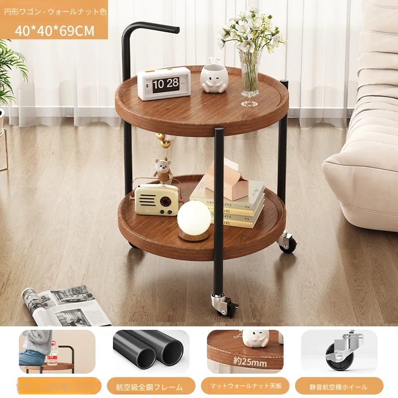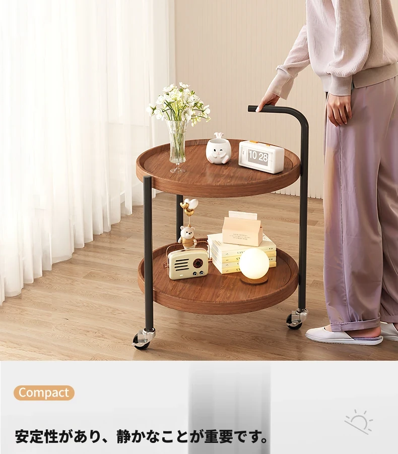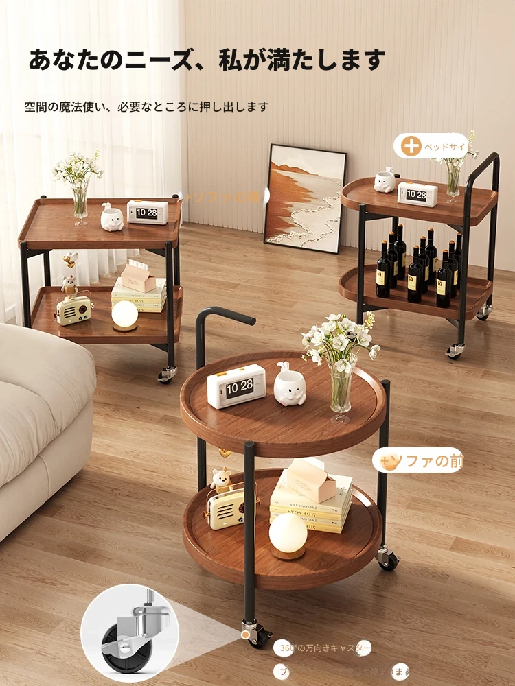 移動可能な丸型木製サイドテーブル - ソファやベッドサイドにぴったり!リビングやバルコニーでの収納にも最適なスタイリッシュなデザイン。快適な空間を演出するおしゃれなサイドテーブルです。