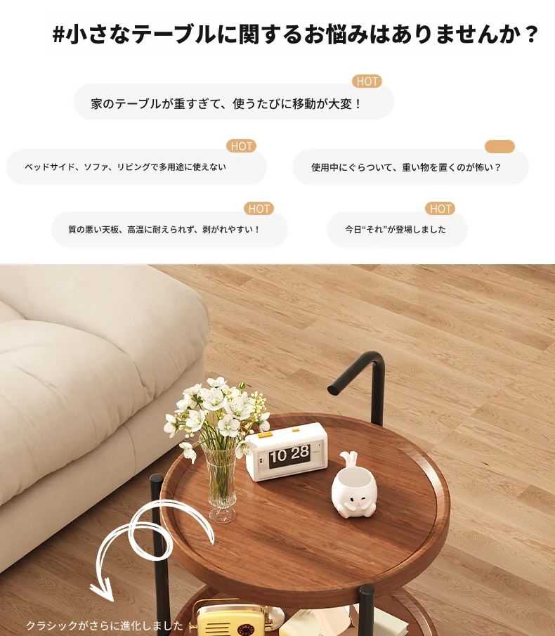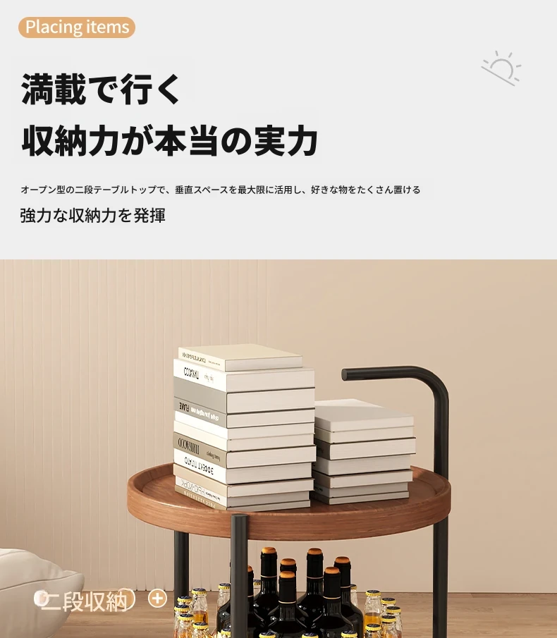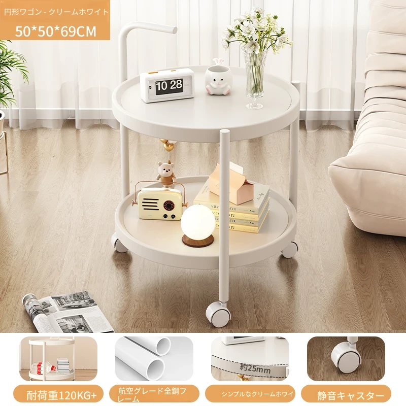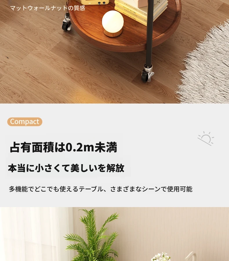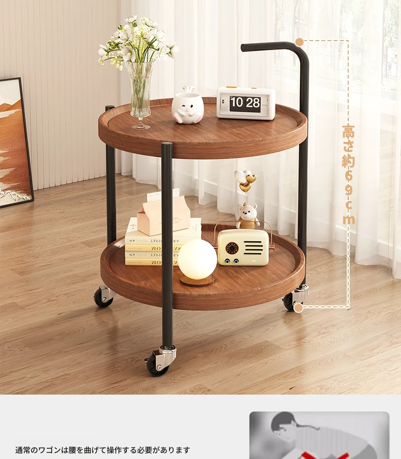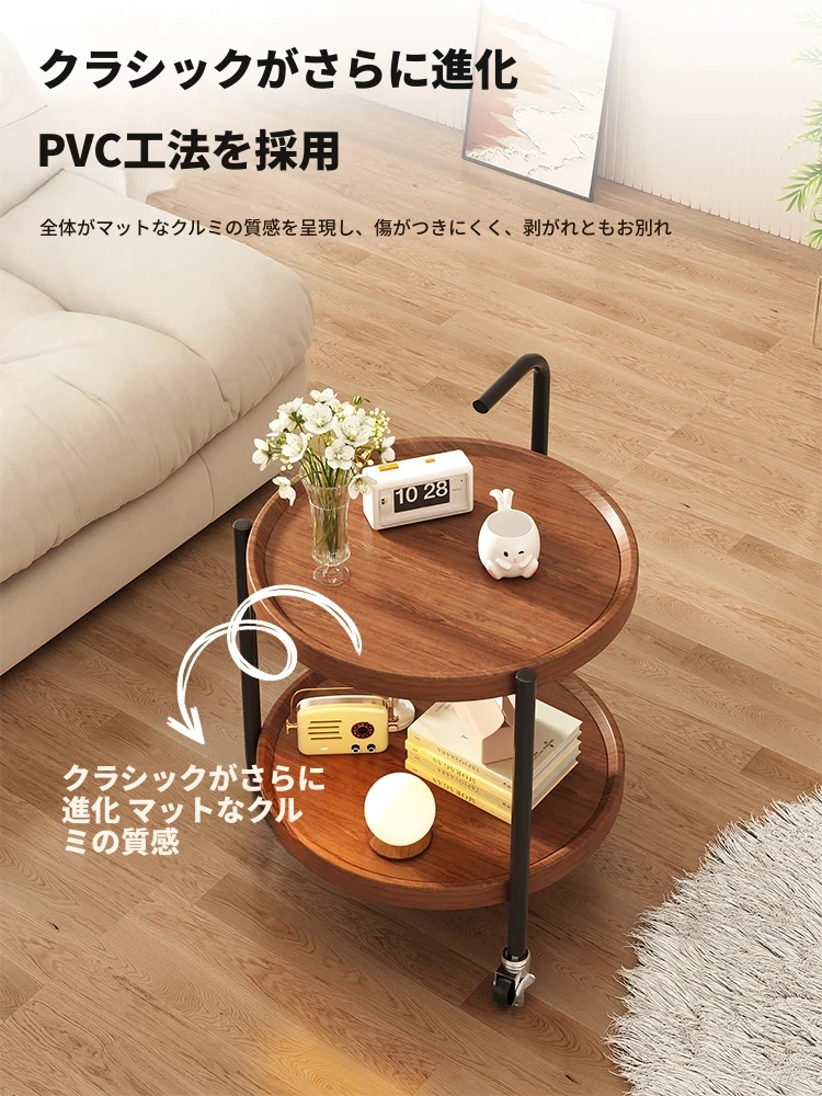 移動可能な丸型木製サイドテーブル - ソファやベッドサイドにぴったり!リビングやバルコニーでの収納にも最適なスタイリッシュなデザイン。快適な空間を演出するおしゃれなサイドテーブルです。