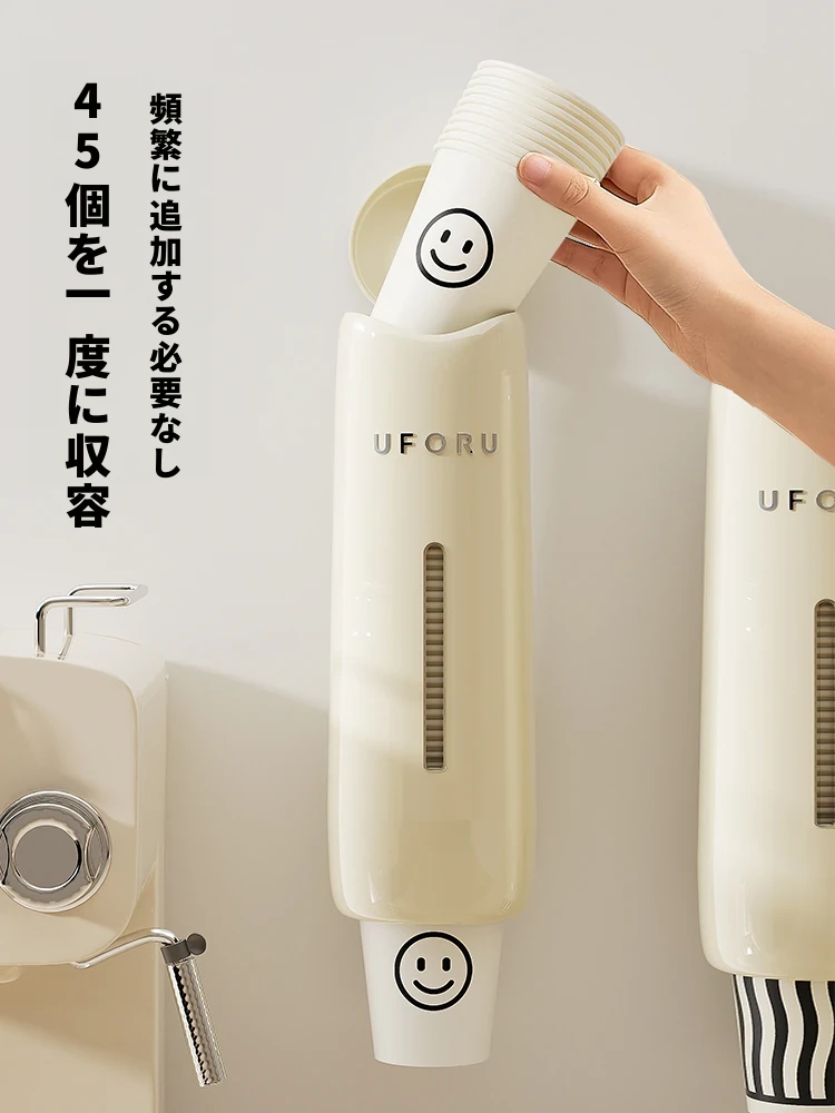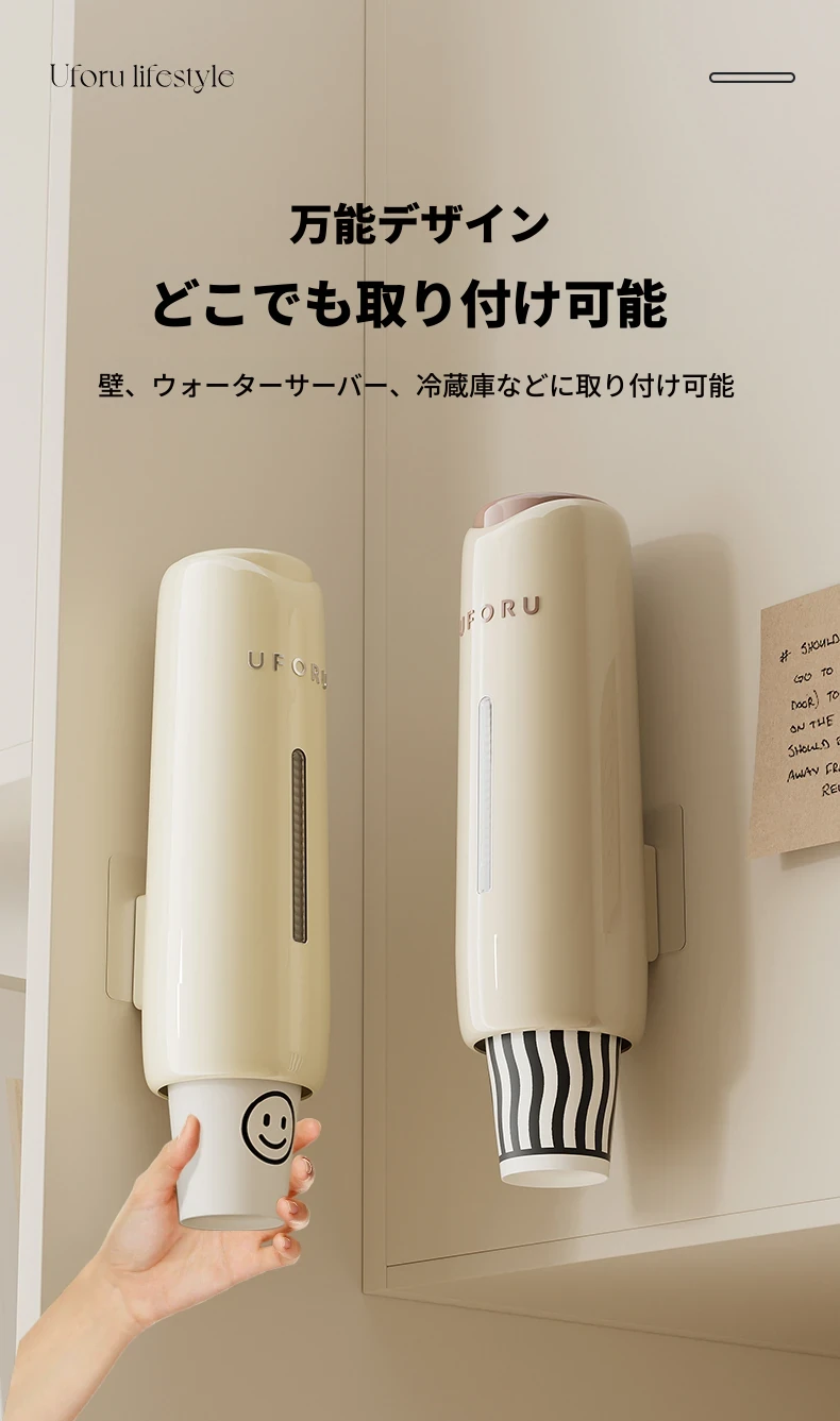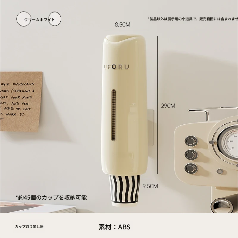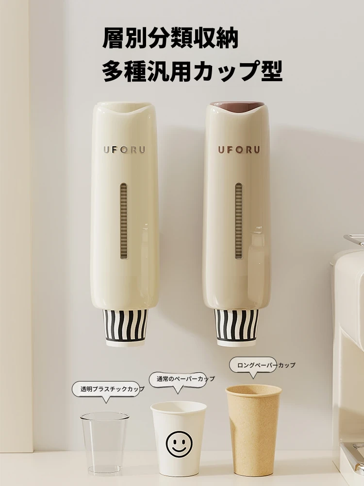 使いやすい!壁掛け式ディスポーザブルカップホルダー - 簡単取り出し、家事を楽にする収納ラック。穴を開けずに取り付け可能で、ほこりからカップを守ります。おしゃれで便利なアイテムで、キッチンやリビングに最適!