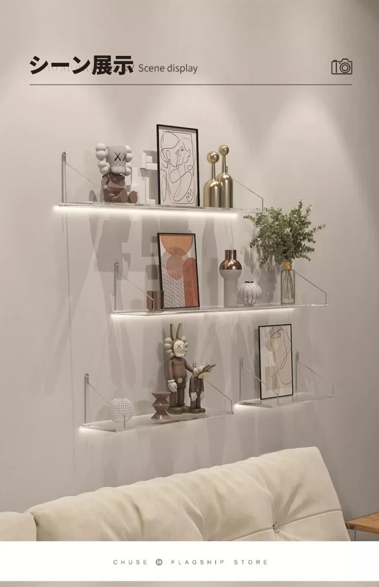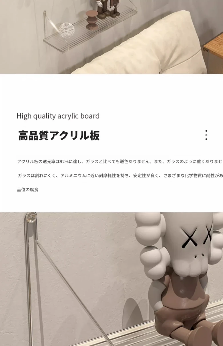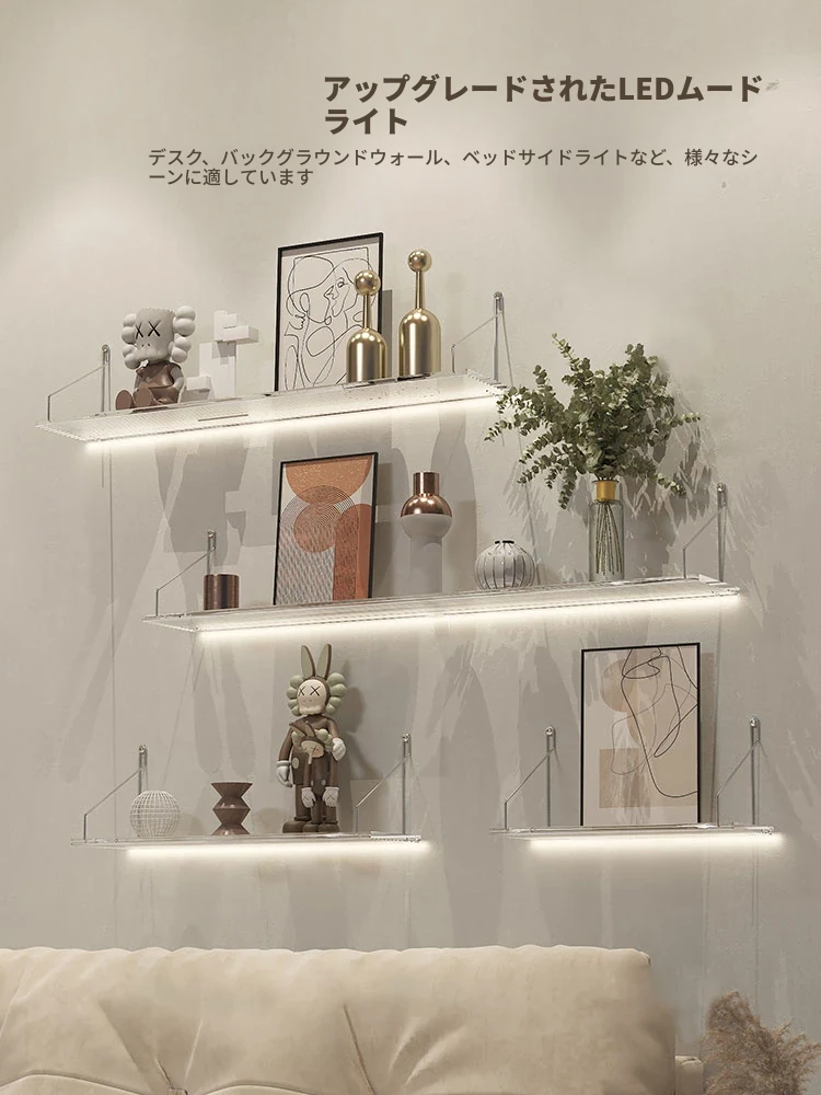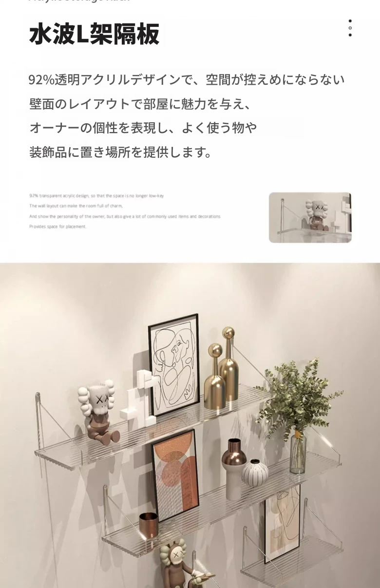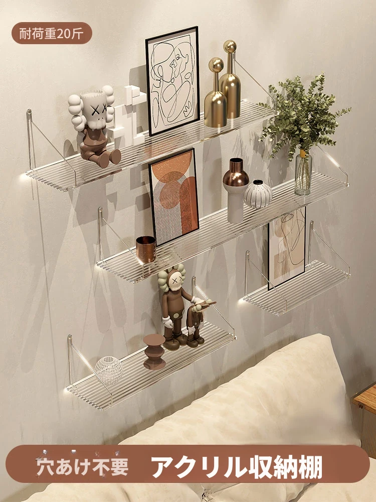 壁掛け式アクリルシェルフ - 穴を開けずに簡単取り付け!スタイリッシュなデザインでリビングの収納と展示を実現!おしゃれな空間を演出するフロアスタンド型ラック。